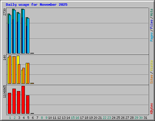 | Day | Hits | Files | Pages | Visits | Sites | KBytes | ||||||